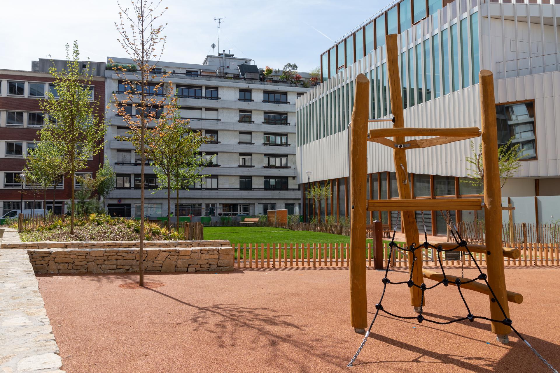 Au sein de ce jardin, vous pouvez retrouver une aire de jeux pour enfants de 145 m2 comprenant des jeux d’adresse, de grimpe et d’équilibre, a été intégrée, du mobilier urbain tel que des bancs et des chaises longues ainsi que des arbres de taille et d'essences variées.