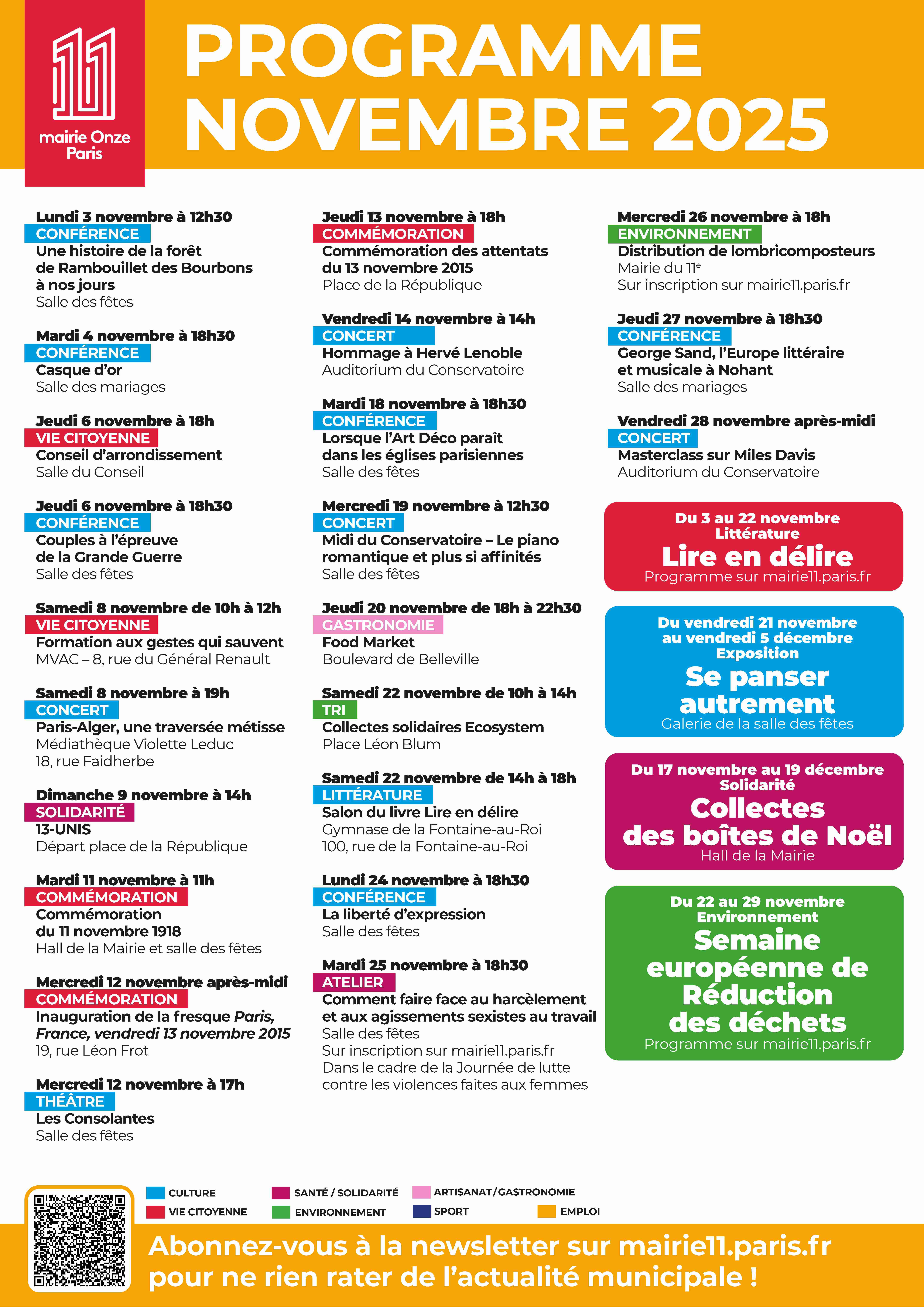Votre agenda de novembre 2025 ! Actualité Mise à jour le 31/10/2025 Découvrez le programme du mois de novembre à la Mairie du 11e ! Commémoration des 10 ans du 13 novembre 2015, conférences culturelles, concerts et salon du livre seront au rendez-vous ! Crédit photo : Service Communication 11e S’abonner à notre newsletter